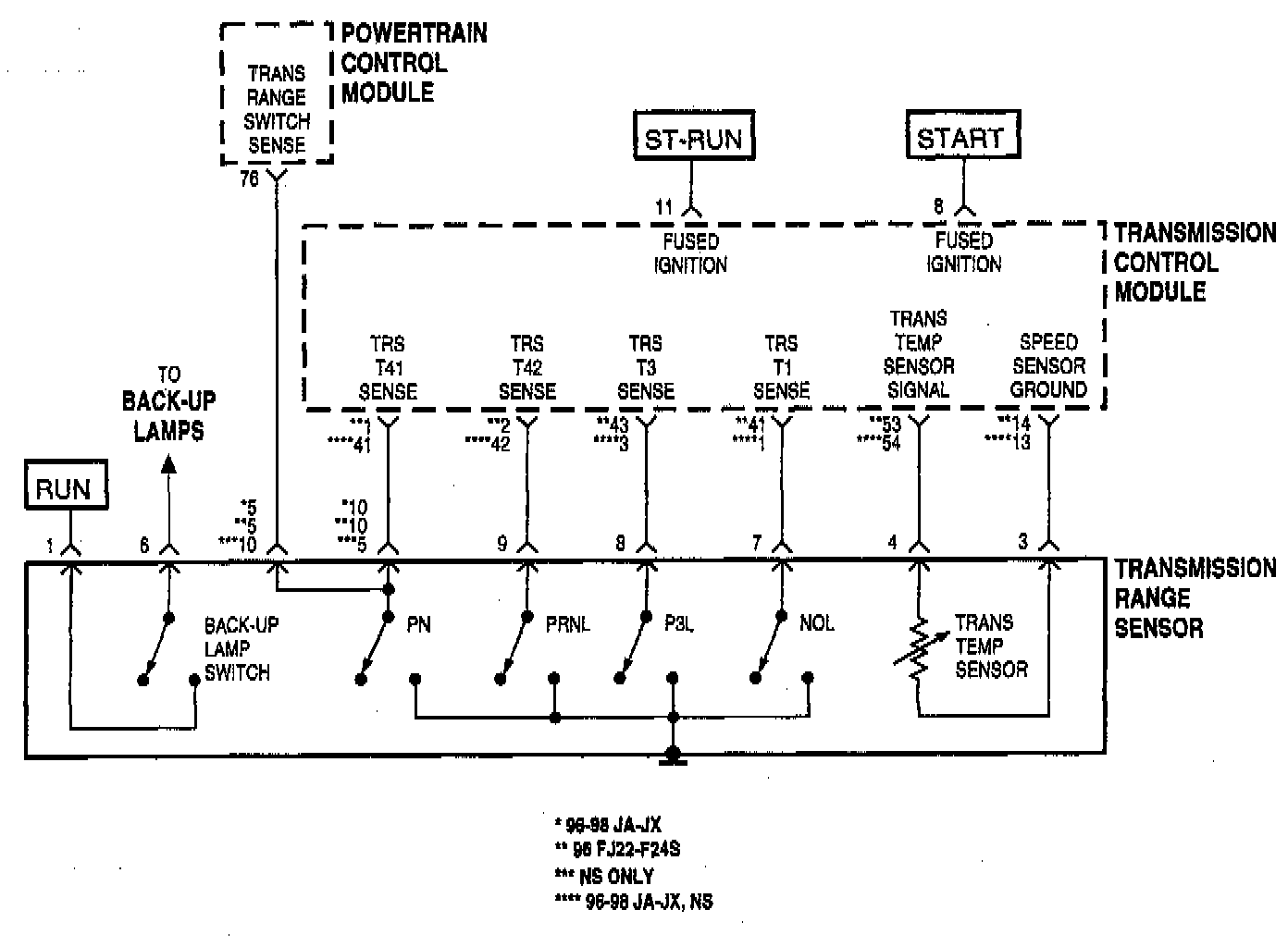 In all 1996 model year vehicles except for early NS vehicles (without TRS) the TCM uses a thermistor to monitor the transmission's sump temperature. This temperature is used to determine which shift schedule the TCM is to use. If the thermistor circuit fails to operate properly the TCM will use the calculated oil temperature routine found in prior model year TCM's. If this occurs for three consecutive key starts, the code will be set. The TCM will then test the thermistor circuit after every 35 OBDII warm-up starts. If the thermistor circuit is OK, the thermistor data is used in place of the Calculated Oil Temperature Routine.