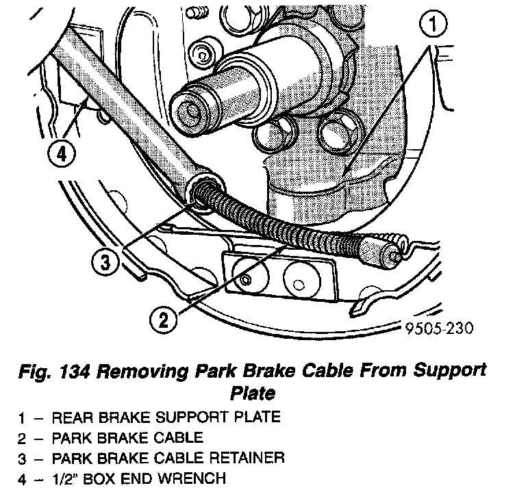 7. Position a 1/2 wrench over the retainer fingers on the end of the parking brake cable. Compress cable housing retaining fingers and start cable housing out of support plate. Remove wrench when retainer is free from the park brake cable mounting hole in the rear brake support plate. Alternate method is to use a aircraft type hose clamp over cable housing end fitting compressing the three fingers.