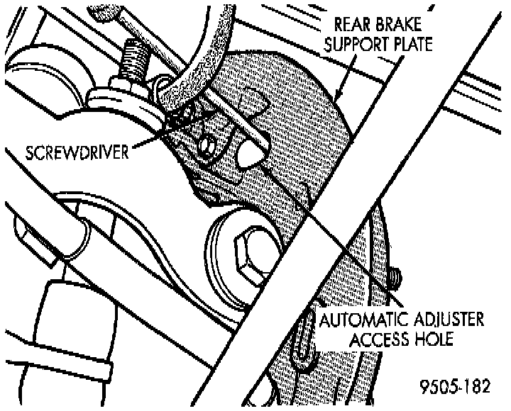 Place the vehicle on a frame contact hoist with a helper in the driver's seat to apply the brakes. Raise the vehicle. Remove the adjuster access plug from the rear brake support plate automatic adjuster access hole. This will allow access to the adjuster quadrant on the automatic adjuster mechanism. Then, to eliminate the possibility of maximum adjustment, insert a small screwdriver through the access hole in the support plate and back off adjuster quadrant approximately 4 to 5 notches.