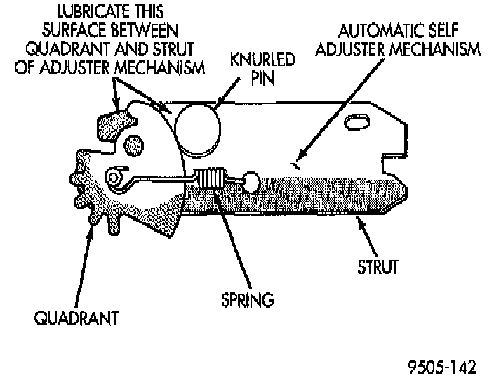 Fully apply the brake pedal which will cause the brake shoes to leave the anchor. Upon application of the brake pedal, the adjuster quadrant should move. Thus, a definite rotation of the adjuster quadrant can be observed if the automatic adjuster is working properly. If one or more adjusters do not function properly, the respective drum must be removed for adjuster mechanism servicing.