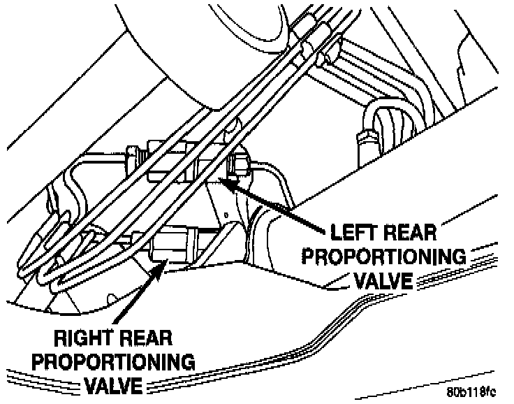 One proportioning valve controls the right rear brake, and the other proportioning valve controls the left rear brake. Therefore, a road test to determine which rear brake slides first is essential. Once the wheel which slides first is determined, use the following procedure to diagnose the proportioning valve.