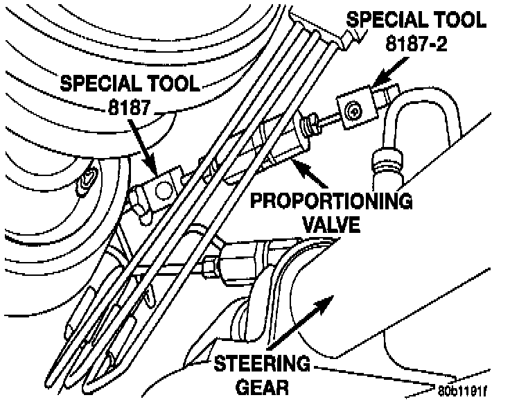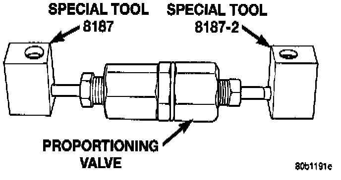 4. Install Pressure Test Fitting, Special Tool 8187 or equivalent in the inlet port of the proportioning valve. Install Pressure Test Fitting, Special Tool 8187-2 or equivalent in the outlet port of the proportioning valve. Tighten tube nuts to a torque of 17 Nm (145 inch lbs.).