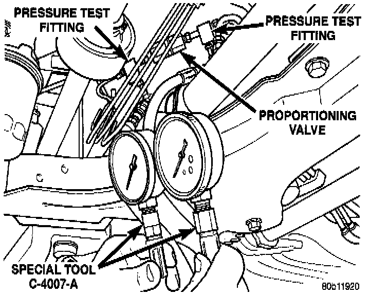 CAUTION: Be sure the pressure test fittings being installed into proportioning valve, have the correct thread sizes for installation into the proportioning valve and installation of rear brake line tube nut.