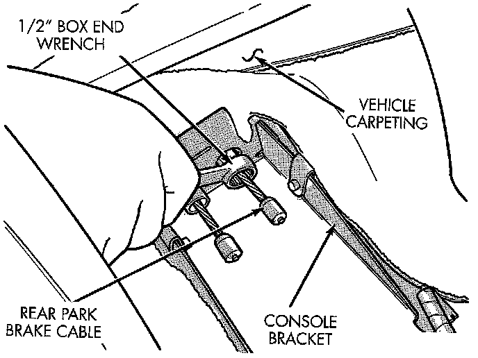 14. Install the box end of a 1/2 inch wrench over the park brake cable retainer as indicated. This will compress tabs on park brake cable retainer, allowing cable to be removed from console bracket. From under carpet, grasp park brake cable housing and pull cable straight out of console bracket.