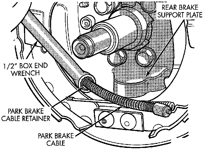 22. Remove park brake cable from rear brake support plate. Park brake cable is removed from brake support plate using a 1/2 inch wrench as shown to compress locking tabs on park brake cable retainer.
