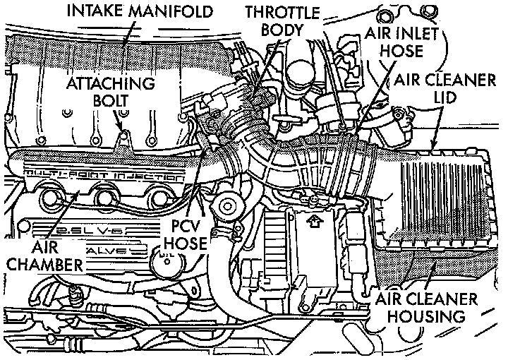 3. Remove the Positive Crankcase Ventilation (PCV) hose from the air chamber located on the front of the intake manifold. Remove bolt attaching the air chamber to the intake manifold. Then unlatch lid of air cleaner from air cleaner housing and loosen clamp attaching air inlet hose to throttle body. Remove the air cleaner lid, air inlet hose and air chamber as an assembly from the engine.