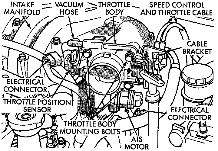 4. Remove the throttle cable and if equipped the speed control cable from the throttle body. Remove the vacuum hose from the throttle body. Remove the wiring harness connectors from AIS motor and the Throttle Position Sensor on the throttle body. Then, remove the 4 bolts attaching the throttle body to the intake manifold and remove it from intake manifold.