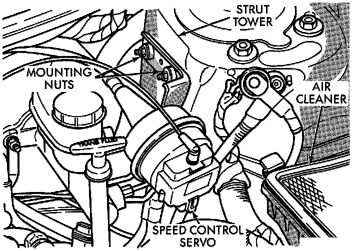 7. If equipped, remove the vehicle's wiring harness connector from the speed control servo. Remove the 2 speed control servo mounting bracket to strut tower attaching nuts. Without removing speed control cable from servo, move speed control servo out of the way.