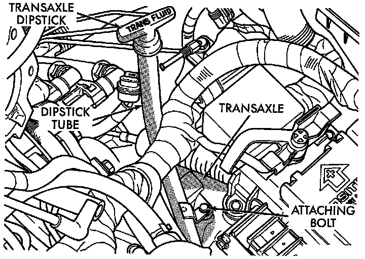 12. Remove dipstick tube attaching bolt. Then remove the dipstick tube and dipstick as an assembly from the transaxle.