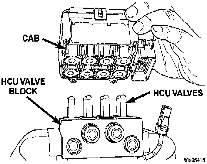 REMOVENOTE: To replace the Controller Antilock Brakes (CAB) on this vehicle, the Integrated Control Unit (ICU) and CAB need to be removed from the vehicle as a unit. The CAB can then be separated from the Hydraulic Control Unit (HCU). Do not attempt to replace the CAB with the ICU mounted in the vehicle.