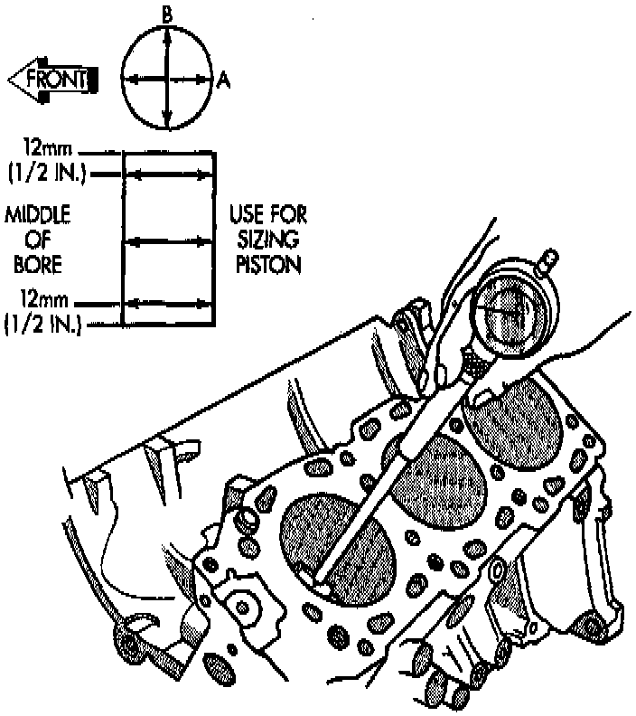 1. Measure the cylinder bore at three levels in directions A and B. Top measurement should be 12 mm (0.50 inch) down and bottom measurement should be 10 mm (0.38 inch) up.