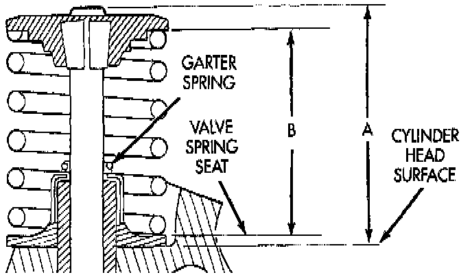 4. Check the valve spring installed height B after refacing the valve and seat. Make sure measurements are taken from top of spring seat to the bottom surface of spring retainer. If height is greater than 38.75 mm (1.525 inch), install a 0.762 mm (0.030 inch) spacer under the valve spring seat to bring spring height back within specification.