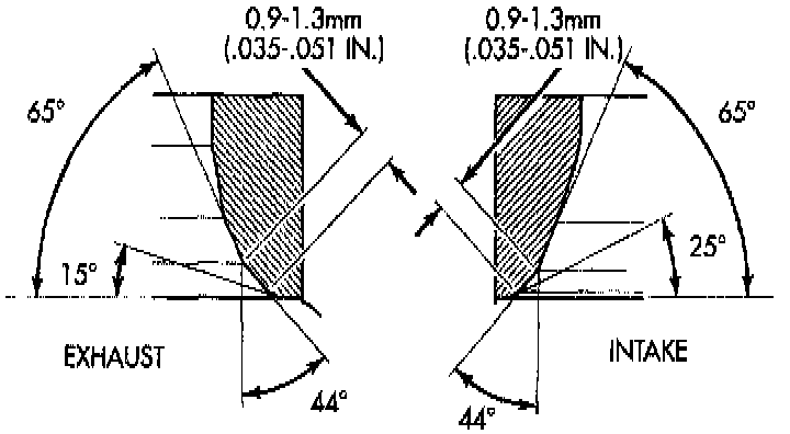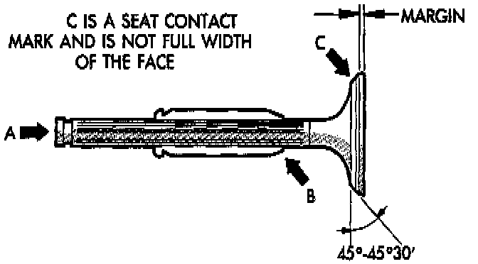 Inspect the valve seat with Prussian blue to determine where the valve contacts the seat. To do this, coat valve seat LIGHTLY with Prussian blue then set valve in place. Rotate the valve with light pressure. If the blue is transferred to the center of valve face, contact is satisfactory. If the blue is transferred to top edge of the valve face, lower valve seat with a 15 degrees stone. If the blue is transferred to the bottom edge of valve face raise valve seat with a 65 degree stone.