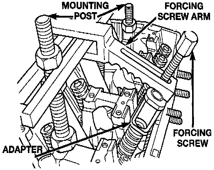2. Use Special Tool MD-998772A with Mounting Post 6886, Forcing Screw Arm 6887, Forcing Screw 6765 and Adapter 6885 to compress valve springs only enough to install locks. Correct alignment of tool is necessary to avoid nicking valve stems (air pressure required), piston at TDC.