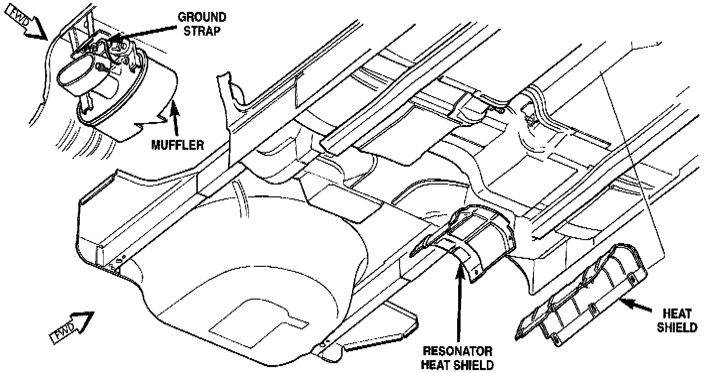 Avoid application of rust prevention compounds or undercoating materials to exhaust system floor pan heat shields on cars so equipped. Light over spray near the edges is permitted. Application of coating will greatly reduce the efficiency of the heat shields resulting in excessive floor pan temperatures and objectionable fumes.