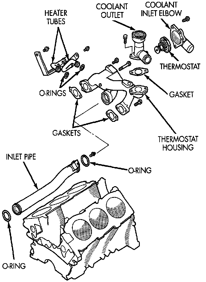 The pipes are also provided with inlet nipples for thermostat bypass, heater return coolant hoses, and brackets for rigid engine attachment. The pipes employ O-rings for sealing at their interconnection and to the water pump.