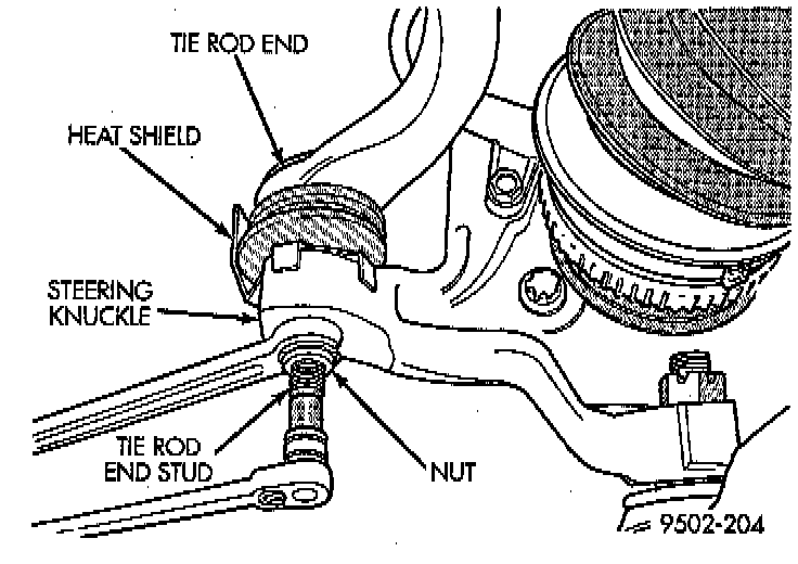 10. Remove nut attaching outer tie rod end to the steering knuckle. Nut is to be removed from tie rod end using the following procedure, hold tie rod end stud with a 11/32 socket while loosening and removing nut with wrench.