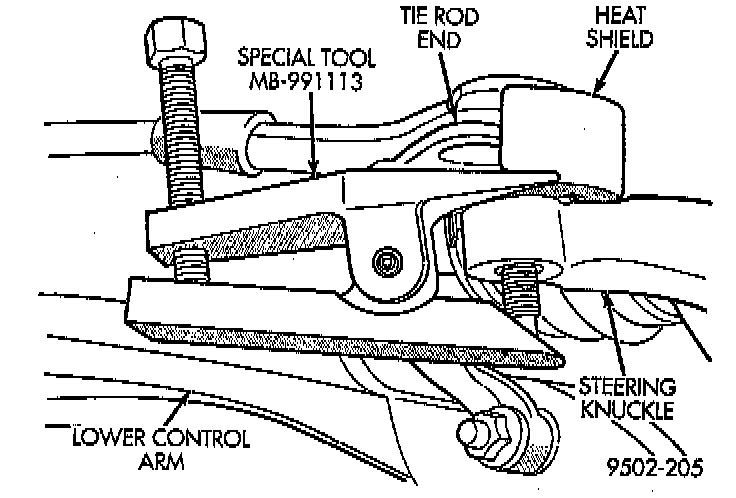 11. Remove the tie rod end from steering knuckle arm, using Remover, Special Tool MB-991113, or equivalent.