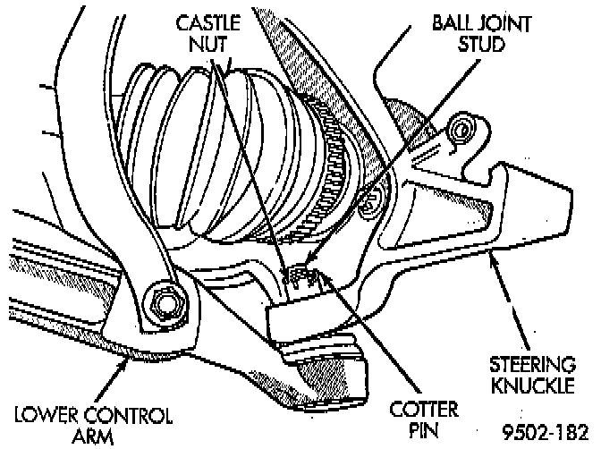 13. Remove cotter pin and castle nut from stud of lower ball joint at the steering knuckle.