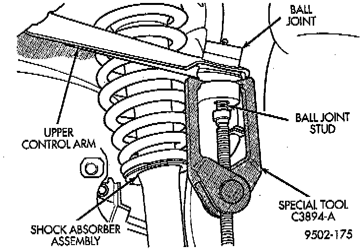 18. Remove the upper ball joint stud from the steering knuckle using Puller, Special Tool, C-3894-A, or equivalent.