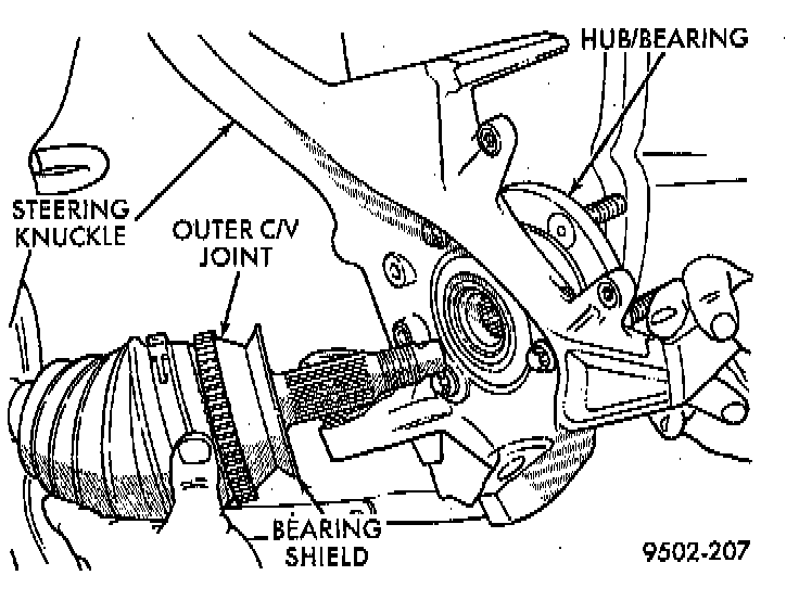 16. Separate the steering knuckle from the outer C/V joint. Separate steering knuckle from outer C/V joint, by supporting the driveshaft while pulling steering knuckle away from the outer C/V joint.