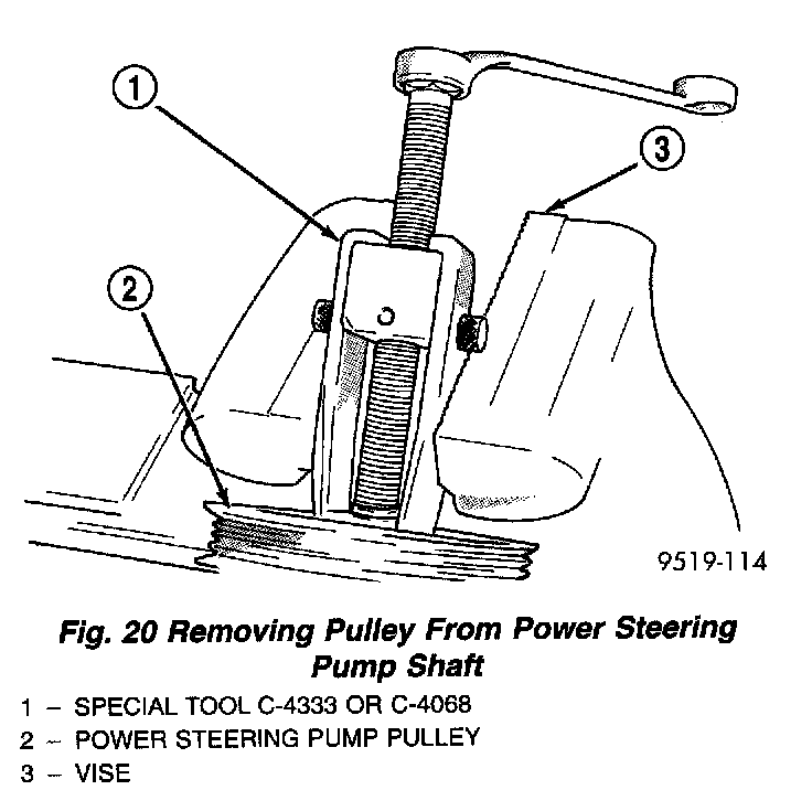 2. Mount Puller, Special Tool C-4333 or C-4068, or equivalents on power steering pump pulley. Mount power steering pump and puller in a vise to keep shaft of power steering pump from turning when removing pulley.