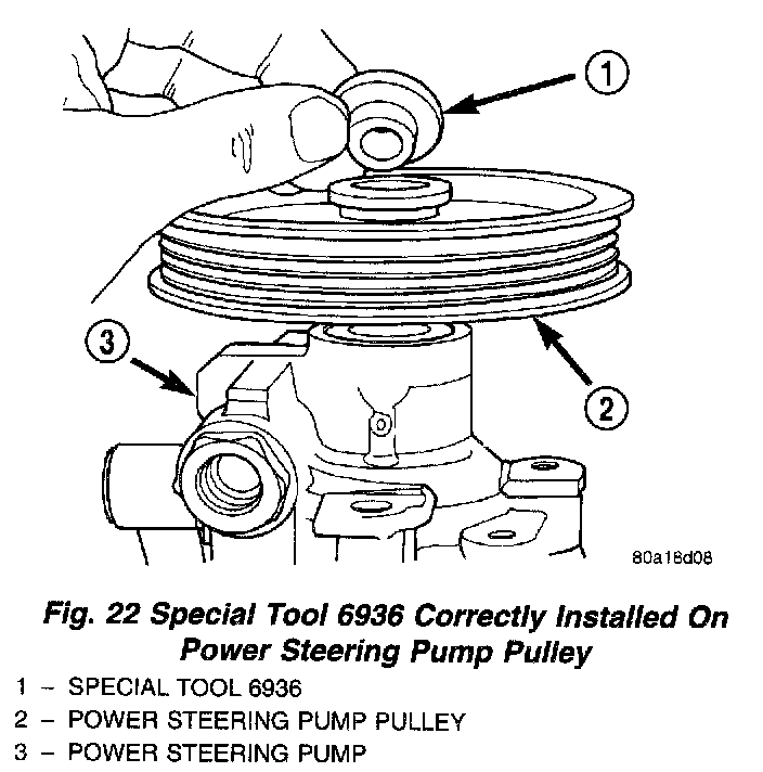 5. Ensuring that special tool and pulley remain aligned with pump shaft, force pulley onto power steering pump shaft until Special Tool 6936, or equivalent is against the end of the power steering pump shaft. When Special Tool 6936 is against the shaft of the power steering pump Special Tool C-4063, or equivalent will no longer be able to be turned.