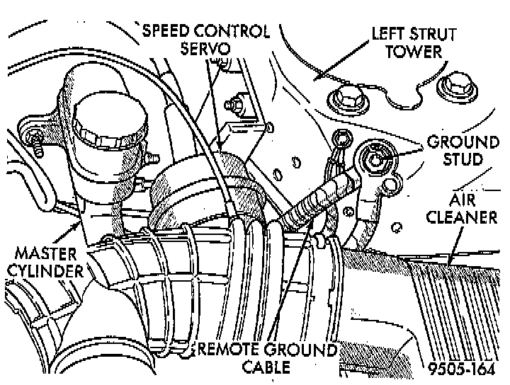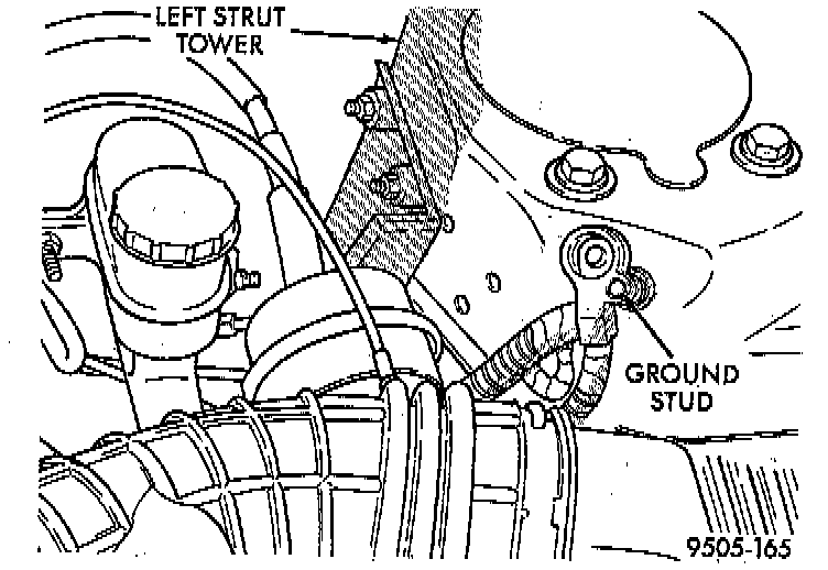1. Remove remote ground cable from ground stud on shock tower. Then correctly isolate ground cable from vehicle by installing isolator on stud.