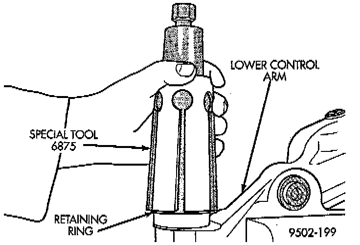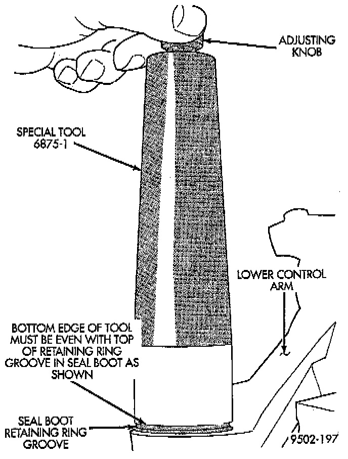 4. Place Retaining Ring Installer, Special Tool, 6875-1, or equivalent over ball joint seal boot. Using adjusting knob, adjust tool so bottom edge of tool is even with top of retaining ring groove in seal boot.