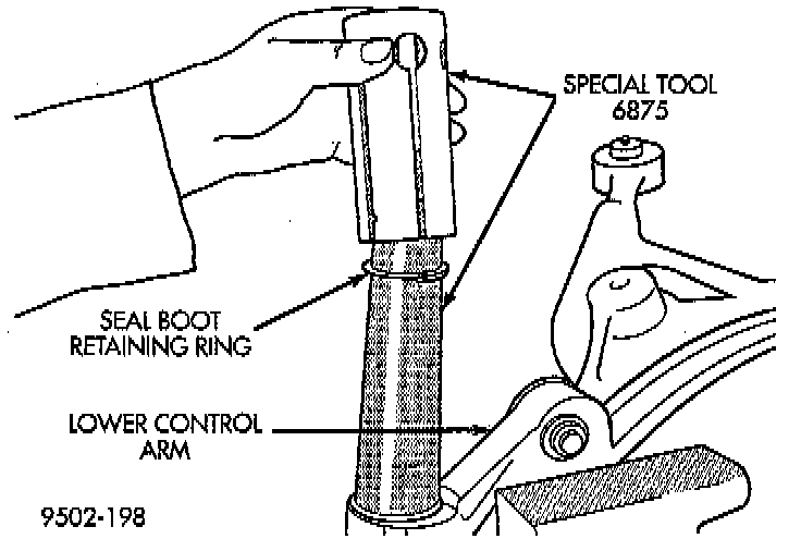 8. Remove Installer, Special Tool, 6875, or equivalent from the ball joint seal boot. When removing tool from seal boot be careful not to damage the seal boot with the tool.