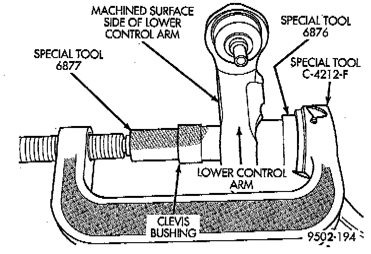 4. Tighten screw on Remover/Installer Special Tool C-4212-F, or equivalent to press clevis bushing out of lower control arm.