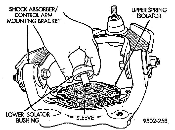 10. Install the upper isolator bushing on the sleeve and the shock absorber/upper control arm mounting bracket.