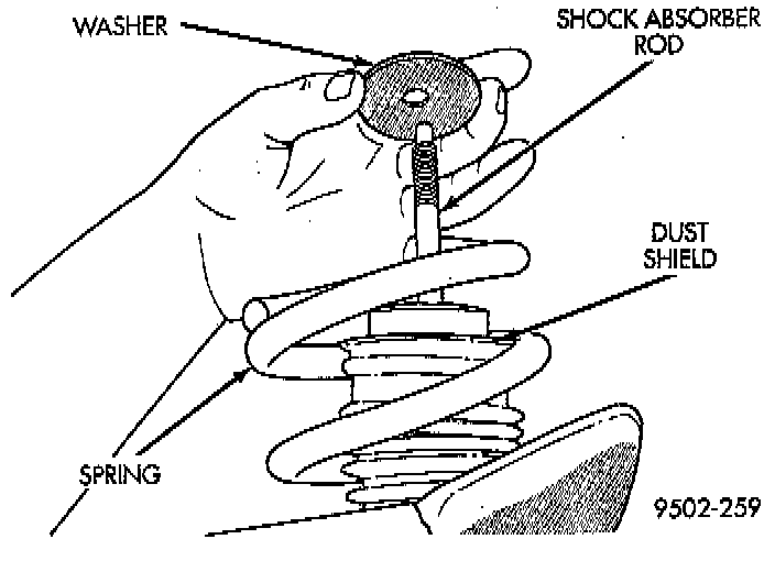 8. Install bottom washer on rod of shock absorber assembly and on top of dust shield.