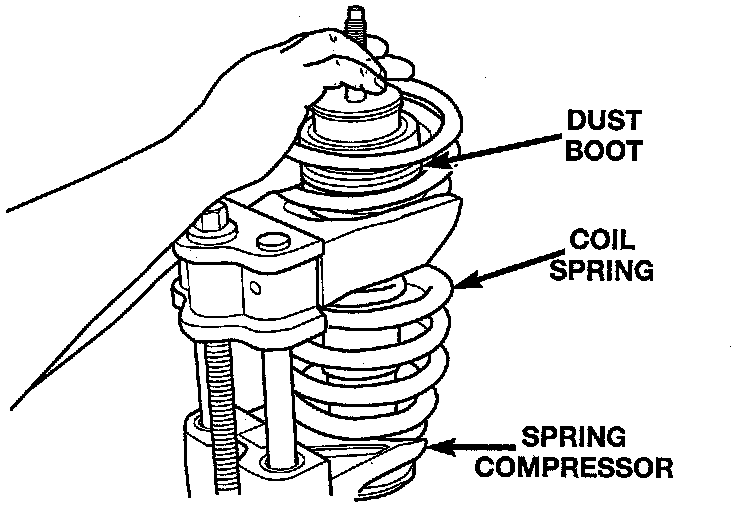 WARNING: If a replacement coil spring is to be installed on the strut assembly, the first full top and bottom coil of the spring must be captured by the jaws of the coil spring compressor.