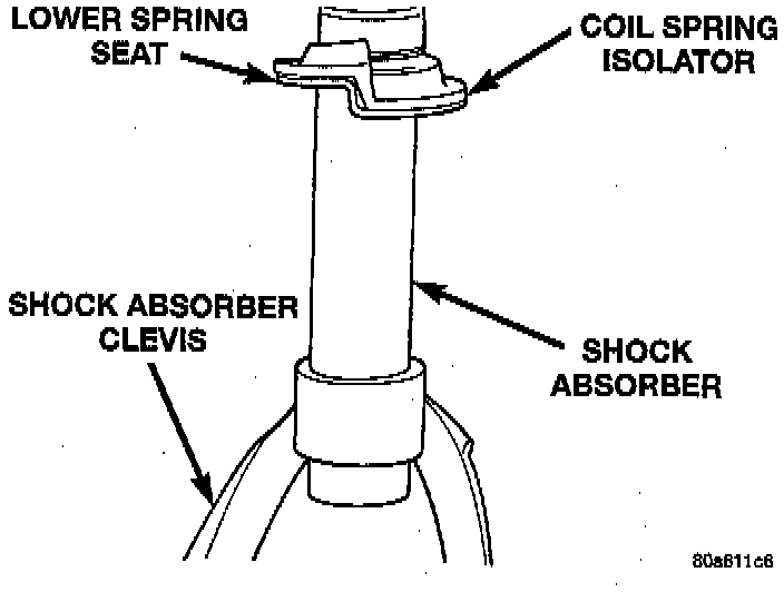 3. Install the coil spring isolator on the lower spring seat of the shock absorber assembly. Isolator must be positioned on lower spring seat as shown.