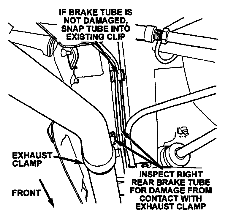 The right rear brake tube must be inspected for evidence of contact and/or wear and repositioned. Brake tubes that have been in contact with the exhaust clamp must be replaced.