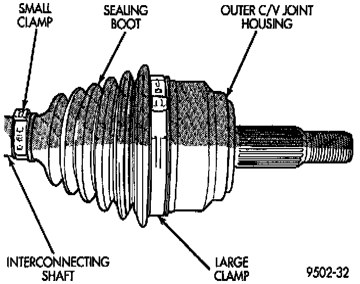 2. Remove large boot clamp retaining C/V joint sealing boot to C/V joint housing and discard. Remove small clamp that retains outer C/V joint sealing boot, to interconnecting shaft and discard. Remove sealing boot from outer C/V joint housing and slide it down interconnecting shaft.