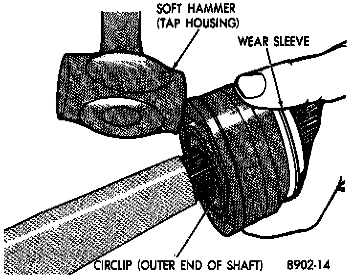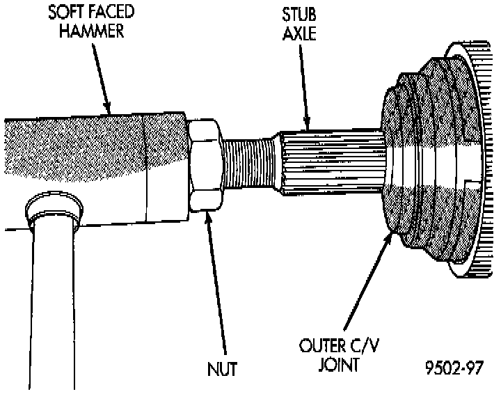 3. Install outer C/V joint assembly onto interconnecting shaft by using a soft-faced hammer and tapping end of stub axle (with nut installed) until outer C/V joint is fully seated on interconnecting shaft.