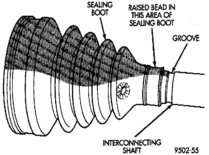1. Slide new sealing boot to interconnecting shaft retaining clamp onto interconnecting shaft. Slide the outer C/V joint assembly sealing boot onto the interconnecting shaft. Seal boot MUST be positioned on interconnecting shaft so the raised bead on the inside of the seal boot is in groove on interconnecting shaft.