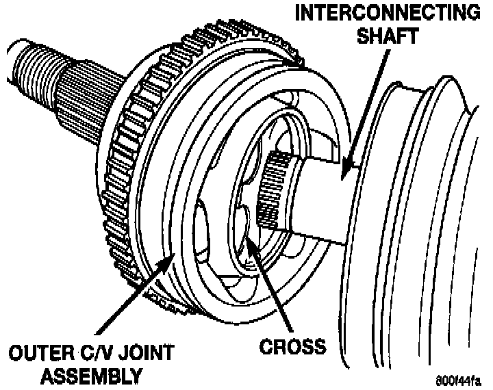 2. Align splines on interconnecting shaft with splines on cross of outer C/V joint assembly and start outer C/V joint onto interconnecting shaft.