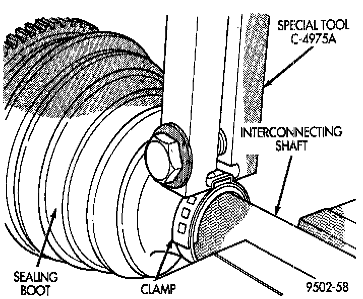 7. Clamp sealing boot onto interconnecting shaft using crimper, Special Tool C-4975-A and the following procedure. Place crimping tool C-4975-A over bridge of clamp. Tighten nut on crimping tool C-4975-A until jaws on tool are closed completely together, face to face.