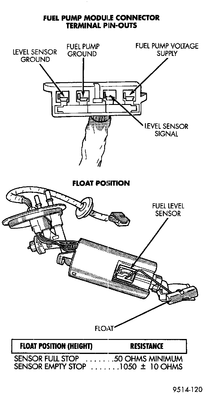 To test the level sensor, connect an ohmmeter across the sensor signal and sensor ground terminals of the fuel pump module connector. Move the float lever over the entire range to the positions shown.