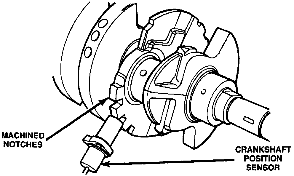 The notches generate pulses from high to low in the crankshaft position sensor output voltage. When a metal portion of the counterweight aligns with the crankshaft position sensor the sensor output voltage goes low (less than 0.5 volts). When a notch aligns with the sensor, voltage goes high (5.0 volts). As a group of notches pass under the sensor, the output voltage switches from low (metal) to high (notch) then back to low.