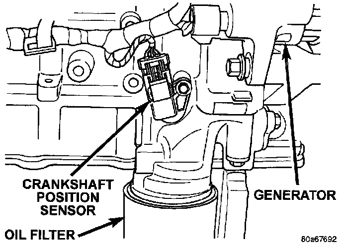 The crankshaft position sensor mounts to the engine block behind the generator, just above the oil filter.