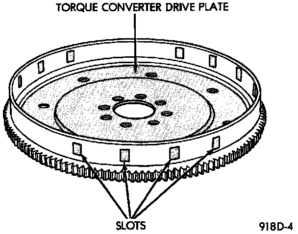 The crankshaft position sensor detects slots cut into the transmission drive plate extension. There are 3 sets of slots. Each set contains 4 slots, for a total of 12 slots. Basic timing is set by the position of the last slot in each group. Once the Powertrain Control Module (PCM) senses the last slot, it determines crankshaft position (which piston will next be at TDC) from the camshaft position sensor input. The 4 pulses generated by the crankshaft position sensor represent the 69°, 49°, 29°, and 9° BTDC marks. It may take the PCM one engine revolution to determine crankshaft position.