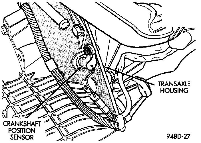 The crankshaft sensor is located on the rear of the transmission housing, above the differential housing. The sensor connector has a christmas tree attached to the heater tube bracket. The bottom of the sensor is positioned next to the drive plate.