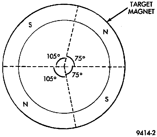 The camshaft position sensor attaches to the rear of the cylinder head. A target magnet attaches to the rear of the camshaft and indexes to the correct position. The target magnet has four different poles arranged in an asymmetrical pattern. As the target magnet rotates, the camshaft position sensor senses the change in polarity. The sensor input switches from high (5 volts) to low (0.30 volts) as the target magnet rotates. When the north pole of the target magnet passes under the sensor, the output switches high. The sensor output switches low when the south pole of the target magnet passes underneath.