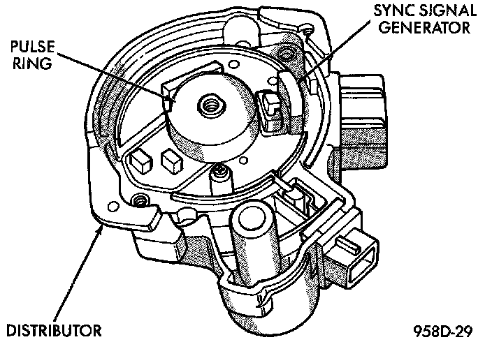 The camshaft position sensor contains a hall effect device called a sync signal generator. This sync signal generator detects a rotating pulse ring (shutter) on the distributor shaft. The pulse ring rotates 180 through the sync signal generator. Its signal is used in conjunction with the crankshaft position sensor to differentiate between fuel injection and spark events. It is also used to synchronize the fuel injectors with their respective cylinders.