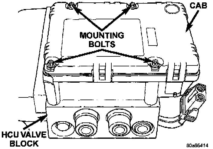 2. Install the 4 bolts mounting the CAB to the HCU. Tighten the CAB mounting bolts to a torque of 2 Nm (17 inch lbs.).
