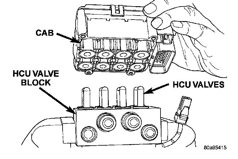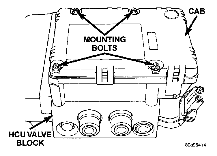 REMOVALNOTE: To replace the Hydraulic Control Unit (HCU) or the Controller Antilock Brake (CAB) on this vehicle, the entire Integrated Control Unit (ICU) needs to be removed from the vehicle. The CAB can then be separated from the HCU. Do not attempt to replace the CAB with the ICU mounted in the vehicle.